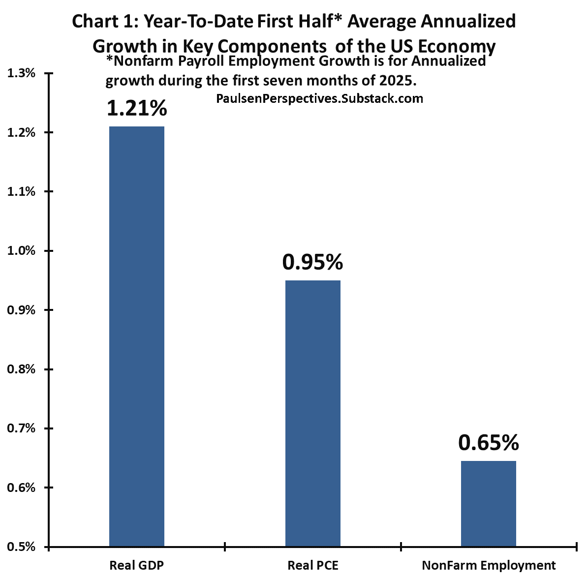 At its press conference last Wednesday, the Fed kept suggesting the economy was okay and they could afford to be patient. However, as shown in chart 1, real average annualized U.S. economic growth has slowed during the first half of this year to only 1% or less! Real GDP has only risen by 1.2% during the first half while real personal consumption is slightly less than 1%. And with Friday’s job report, nonfarm payroll employment so far this year has risen at an average annualized pace of only 0.65%! Looking at first half growth by averaging the last two quarters eliminates the distortions created in both the first and second quarters by an import surge and then an import collapse as private players were front-running potential tariffs. So, averaging the first half of this year is a pretty good indication of the sustained pace of real U.S. economic growth. What are we doing with a national average 30-year mortgage rate still close to 7% in an economy growing at 1%? There is nothing “healthy or solid” about these numbers, they are way below the 2% stall speed, and shout for help.