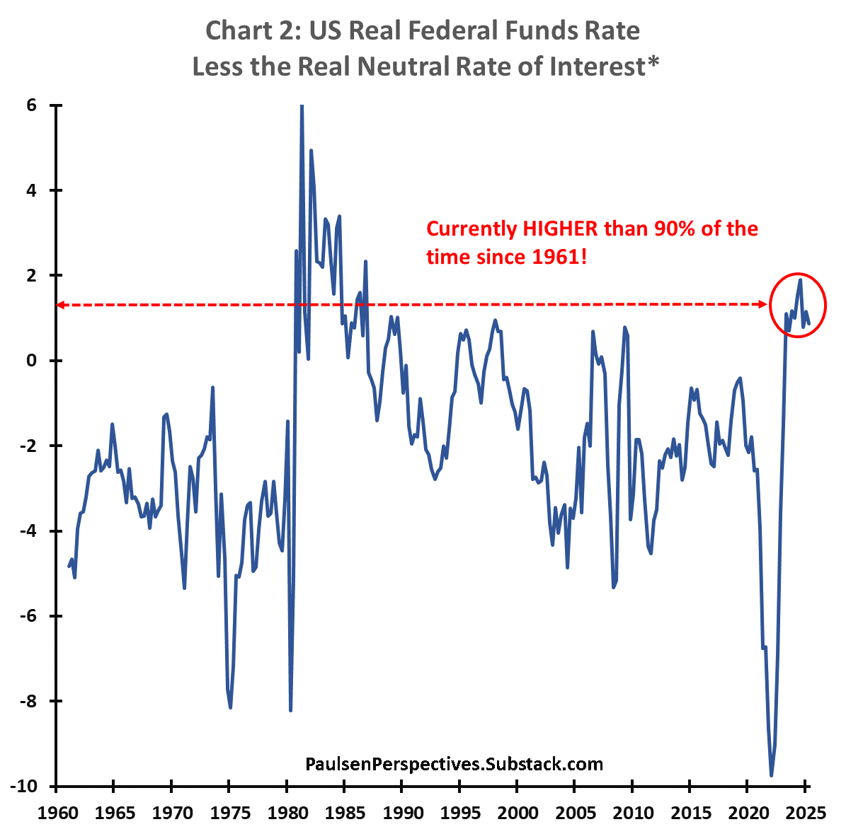 The neutral rate of interest, also referred to as the natural rate of interest, is a theoretical short-term real interest rate that maintains the economy at full employment and stable inflation. It is the rate at which monetary policy is considered to be neither stimulatory nor restrictive. As shown in chart 2, the current real Fed Funds rate has been hovering about 1% above the neutral rate during the last couple years which is higher than about 90% of the time since 1961. As shown in chart 2, usually the real funds rate has been below the real neutral rate. Indeed, with the U.S. economy currently growing near 1% in real terms, the situation probably demands a real Funds rate which is 2% or more “below” the neutral rate? The Fed has been and remains much too restrictive.